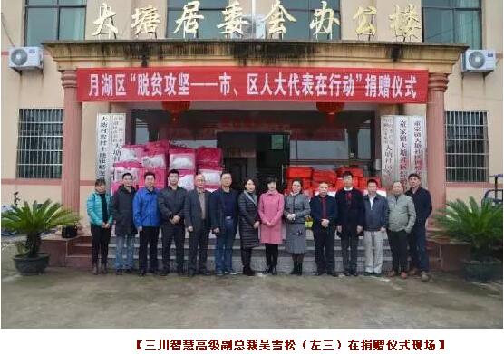 三川智慧总裁李强祖,于2016年11月当选为鹰潭市第九届人大常委会委员。此次在月湖区人大常委会组织的"脱贫攻坚--市、区人大代表在行动"捐赠仪式上,一次性以个人名义捐款人民币15,200元。星空体育平台高级副总裁吴雪松受李强祖总裁委托,出席了本次捐赠仪式。