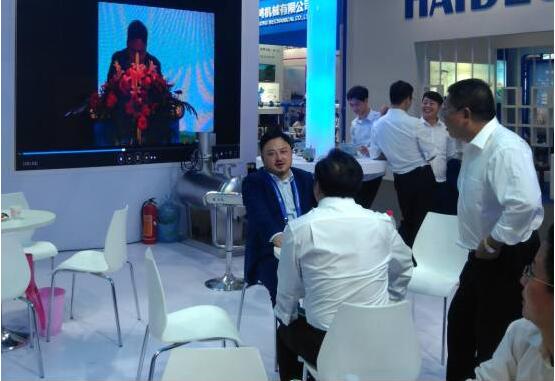 为您服务:营销中心副总裁亲自为北京自来水集团总经理高踪阳至展区介绍产品。